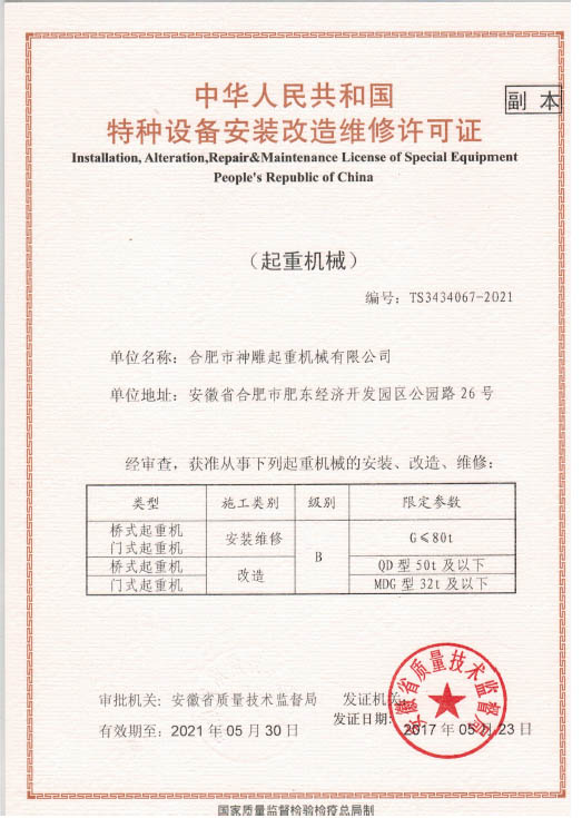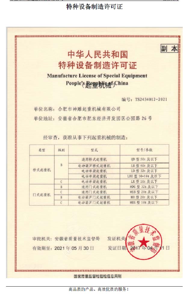 合肥神雕起重機械有限公司是股份制企業(yè),位于合肥東部經(jīng)濟開發(fā)區(qū)公園路848號.占地面積2萬多平方米,建筑面積約一萬平方米.現(xiàn)有職工480余人,其中高級技工43人,中、高級技術(shù)人員28人.產(chǎn)品經(jīng)ISO9001:2000認(rèn)證,國家級生產(chǎn)許可證認(rèn)證,生產(chǎn)神起牌電動單梁起重機,橋式雙梁起重機、門式起重機、抓斗式等分列起重機,生產(chǎn)能力達到年產(chǎn)3000臺,年產(chǎn)值過億元. 公司堅持奉行“關(guān)注顧客,追求卓越,誠 ...